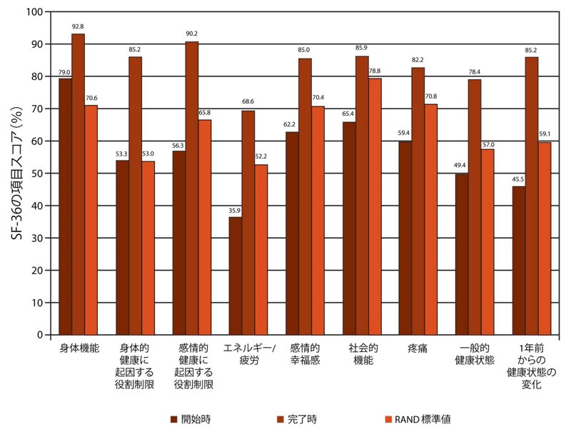 参加者の治療前の健康に関連したQOLスコアは、9項目の内、「身体機能」および「身体的健康に起因する役割制限」を除く全項目においてRAND標準値と比較し有意に低かった。 治療後の参加者のスコアは、治療前のスコアと比較し、統計的に有意な改善を示した。 また参加者の治療後のスコアは、RAND標準値と比較し、すべての項目において有意な改善を示した。